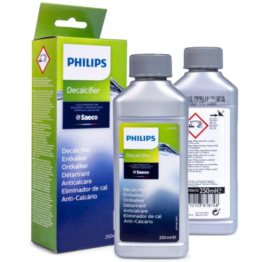 Odkamieniacz CA6700/10 do ekspresów do kawy to płyn przeznaczony do usuwania osadów wapiennych i kamienia z automatycznych ekspresów ciśnieniowych. Odkamienianie ekspresu należy wykonać jeśli urządzenie sygnalizuje taką potrzebę wyświetlając odpowiedni komunikat lub jeśli ekspres nie był długo używany. Proces ten należy wykonywać zgodnie z instrukcją obsługi urządzenia. Płyn wlewa się w odpowiedniej ilości do pojemnika na wodę. Po przeprowadzeniu oczyszczenia smak kawy wyraźnie się poprawia. Jedna butelka preparatu wystarcza na kilka użyć, w zależności od częstotliwości parzenia kawy.