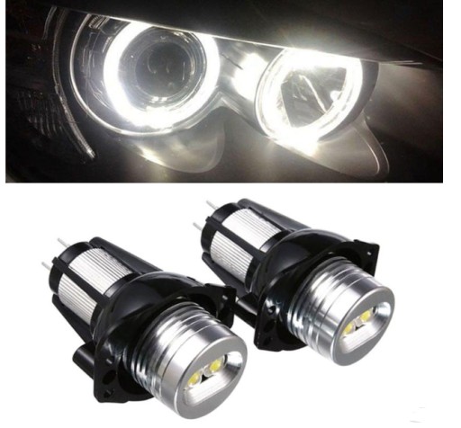 Żarówki LED wraz z oprawkami oraz zestawem przejściówek, tzw Angel Eyes (oczy anioła) - zmieniają barwę światła z tradycyjnych żółtych (halogen) na białą zimną barwę (LED)