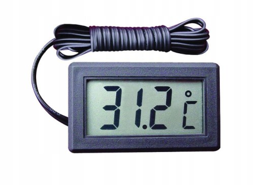 Wysokiej jakości elektroniczny termometr z dużym wyświetlaczem LCD i sondą na długim kablu. Termopara (czujnik) może zostać umieszczona w dowolnym miejscu - akwarium, lodówce, zamrażarce, szklarni.