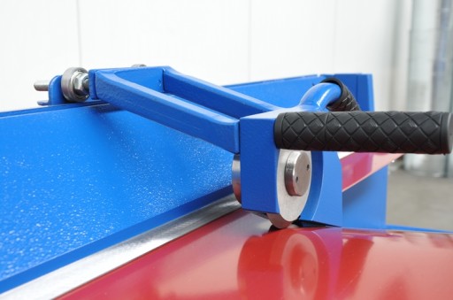 Belka dociskowa jest tak skonstruowana, że jej górna część stanowi jedną z prowadnic dla nożyc krążkowych. Drugą prowadnicą jest belka gnąca zaginarki. Blachę tniemy, po uprzednim jej zamocowaniu na zaginarce.