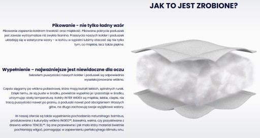 - Wypełnienie: LEKKIE, CIEPŁE I SPRĘŻYSTE - 100% puszyste włókno poliestrowe rurkowe spiralne silikonizowane HCS