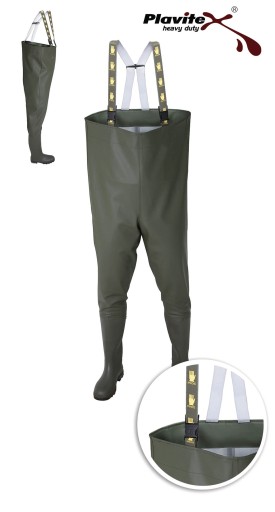 Spodniobuty wodoochronne z wgrzanymi na stałe wysokiej jakości kaloszami. Posiadają regulowane szelki z elastycznej, szerokiej gumy. Model produkowany z wodoochronnej, wytrzymałej tkaniny Plavitex Heavy Duty. Przeznaczony szczególnie dla wędkarzy i rybaków do użytku przy wszelkich pracach rybackich. Zapewniają skuteczną ochronę przed wodą. Technika obustronnego zgrzewania zwiększa wytrzymałość szwów.