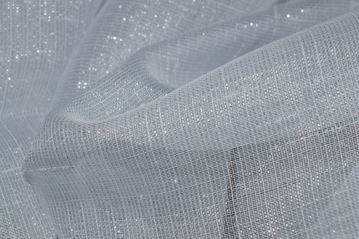 oprócz białej nitki naprzemiennie wpleciono srebrną mieniącą się nić przez co tkanina magicznie połyskuje podnosząc jej walor estetyczny.