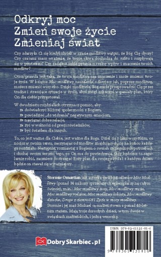 O autorze: Stormie Omartian jest autorką serii bestsellerów Moc Modlitwy (ponad 34 miliony sprzedanych egzemplarzy na całym świecie), m.in.: Moc modlitwy żony, Moc modlitwy męża, Moc modlitwy rodzica, Moc modlitwy kobiety, Moc modlitwy dziecka, Droga z ciemności i Życie w mocy modlitwy. Stormie i jej mąż Michael są małżeństwem z ponad 40-letnim stażem. Mają troje dorosłych dzieci, w tym dwoje w związkach małżeńskich, i jedną wnuczkę.