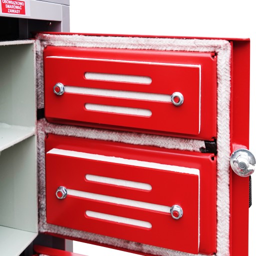 Wszystkie produkowane przez nas kotły posiadają izolowane drzwiczki. Izolacja w postaci płyty ceramicznej o grubości 25 mm odporna na wysokie temperatury umieszczona została w wewnętrznej części drzwiczek, została wbudowana w ich środek. Wszystkie drzwiczki posiadają również izolację w postaci sznura szklanego zapobiegającą wydostawaniu się dymu z wnętrza kotła. Nasze kotły standardowo wyposażamy w ślimakowe rączki zamykające drzwiczki a także w nóżki z regulowaną nastawą wysokości. Umożliwiają one szybkie i właściwe ustawienie - wypoziomowanie - kotła. Prawidłowe ustawienie zestawu grzewczego, poziomie, gwarantuje prawidłową pracę kotła z podajnikiem ślimakowym. Cechy szczególne naszych kotłów podajnikowych, osprzętu oraz wykonanie omawiamy poniżej w dalszej części opisu.