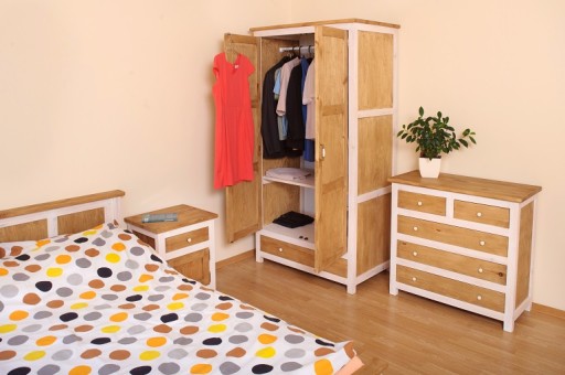 - Regał z drewna litego sosnowego, woskowany. Pokryty naturalnym woskiem w dwóch kolorach. Elementy konstrukcji, oraz półki pokryte zastały woskiem w kolorze białym nie kryjącym, natomiast szuflada, filunki boczne (wypełnienie konstrukcji mebla) oraz tył z boazerii okryte zostały woskiem w kolorze orzech. Regał posiada 5 ruchomych półek, których wysokość można dowolnie zmieniać.szuflady bez prowadnic,otwieranie odbywa sie po drewnianych listwach. Meble dostarczane są w całości ,oprócz stołów,sekretarzyków ,łóżek
