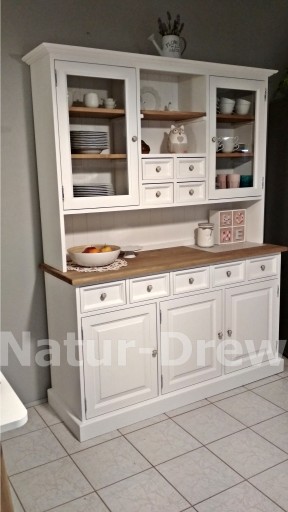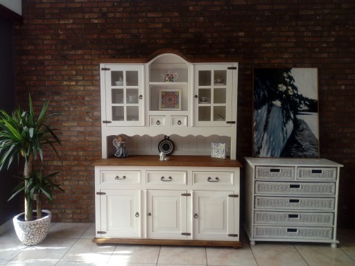 - Kredens Drewniany Składa się z dwóch części -nadstawki i komody oddzielonej od siebie blatem.Nadstawka Kredensu posiada przeszklone podwójne drzwi oraz polkę po środku,natomiast pod blatem znajdują sie trzy funkcjonalne szuflady wysuwane na drewnianych prowadnicach ,a pod nimi zamykane szafki.Całość wzbogacają ręcznie kute pordzewiałe zawiasy i uchwyty,które nadają duszy meblom z tej serii.