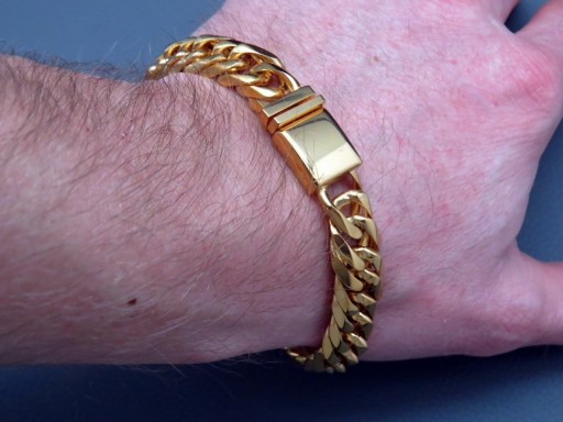 W tej ofercie prezentujemy wyjątkowo elegancki model bransolety męskiej, który wykonany jest z NAJWYŻSZEJ JAKOŚCI STALI CHIRURGICZNEJ 316L platerowanej 18k złotem. Model ten wyróżnia bardzo elegancki i unikatowy splot elementów, na których przepięknie załamuje się światło. Całość na dłoni robi niesamowite wrażenie !!! Jest to jeden z najciekawszych i najlepiej sprzedających się modeli w ostatnim czasie !