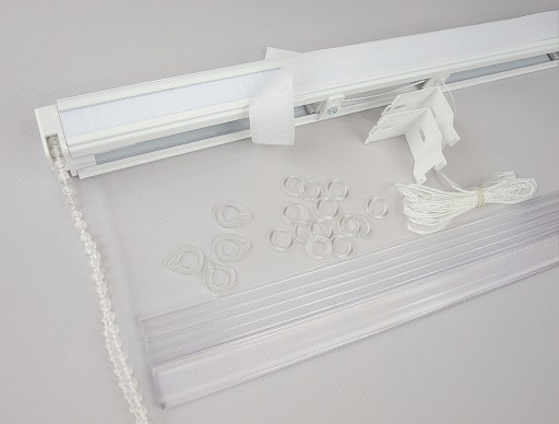 - kompletnie wyposażona szyna z rolkami złożona na wymiar ( ilość rolek - 5 szt, długość sznurków - 280 cm)
