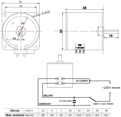 230VAC, moc max 35W, 2,5 OBROTÓW NA MINUTĘ