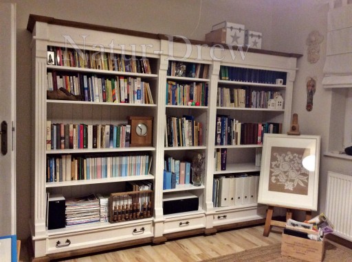 - Drewniany Regał na książki,postarzany z piękną zdobioną koroną u góry,regał posiada trzy regulowane półki,które ułatwiają dopasowanie u dołu posiada drewniane funkcjonalne szuflady wysuwane na drewnianych prowadnicach,dodatkowym atutem regału są ręcznie kute zawiasy i uchwyty które nadają charakteru i duszy meblom z tej serii.