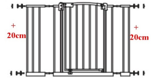 Wysokość bramki wynosi 75-79 cm - zapewnia to bezpieczeństwo wszystkim dzieciom. Minimalna szerokość montażu to 73-82 cm, maksymalna zaś to aż 113-122 cm. W zestawie wraz z bramką znajdują się 2 dodatkowe rozszerzenia o szerokości 20 cm.
