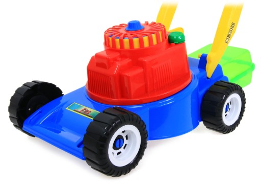 Kosiarkę wyposażono w kosz z kuleczkami, które przesypują się podczas jazdy, co daje efekt wsypywania trawy.