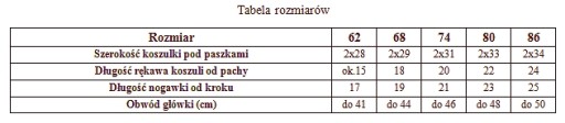 Komplety dostępne są w rozmiarach od 62 do 86.