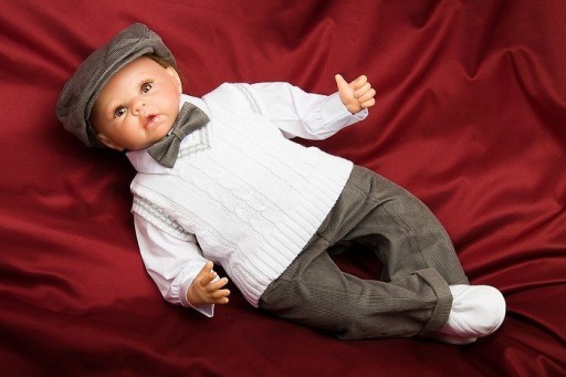 W skład kompletu wchodzi: dzianinowa kamizelka, sztruksowe spodenki, koszula, czapeczka typu kaszkiet oraz muszka.