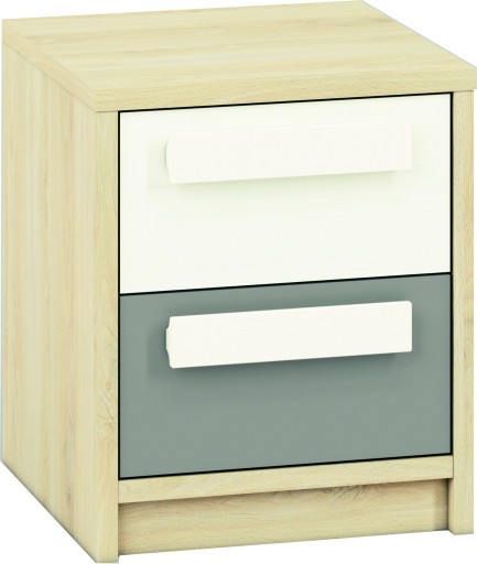 Szafka nocna Drop 13 Składa się z dwóch szuflad. Kolekcja została zaprojektowana z myślą o nowoczesnym wzornictwie. Jasny naturalny bukowy kolor korpusu wyprodukowany z wysokiej jakości płyty laminowanej o grubości 22mm,różnobarwne fronty oraz geometryczne uchwyty wykonane z drewna w kolorze białym podkreślają nowoczesny styl programu Drop.