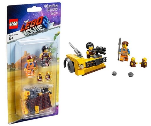 W zestawie 2 minifigurki: Emmet,mieszkaniec Apokalipsburga i dwójka kanałowych dzieciaków oraz samochodowa barykada do zbudowania z miotaczem klocków, błotnikiem, reflektorami i włócznią.