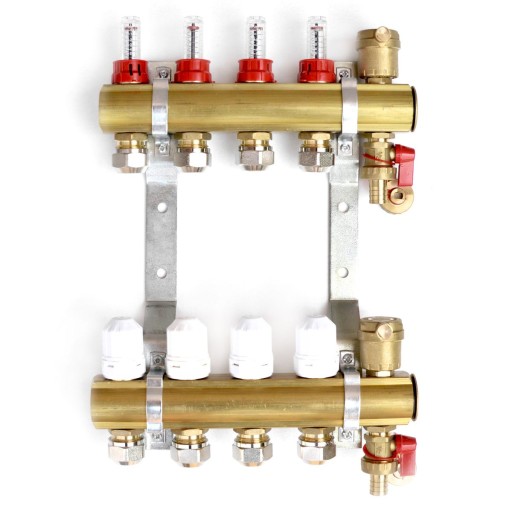 Belka górna(zasilająca) wyposażona w przepływomierze o przepływie 0-5L/min. Umożliwiają precyzyjne ustawienie przepływu czynnika grzewczego.Na nyplach złączka która umożliwia podłączenie rury PEX/AL/PEX 16.