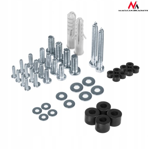 W zestawie komplet śrub do montażu uchwytu do ściany oraz telewizora do uchwytu.