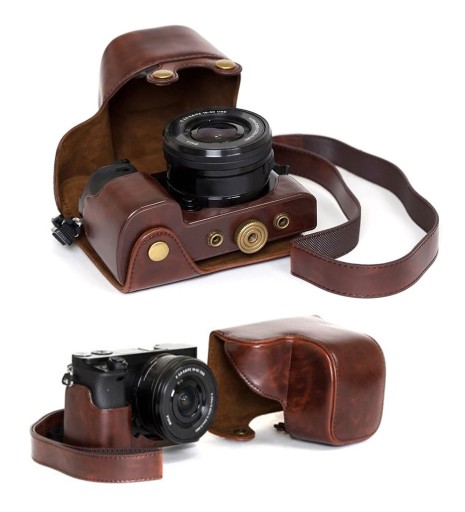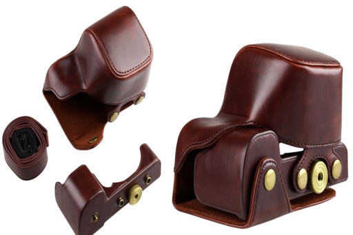 Skórzane etui z osłoną obiektywu, które chronią aparat i obiektyw, pozwalając jednocześnie na szybkie robienie zdjęć.