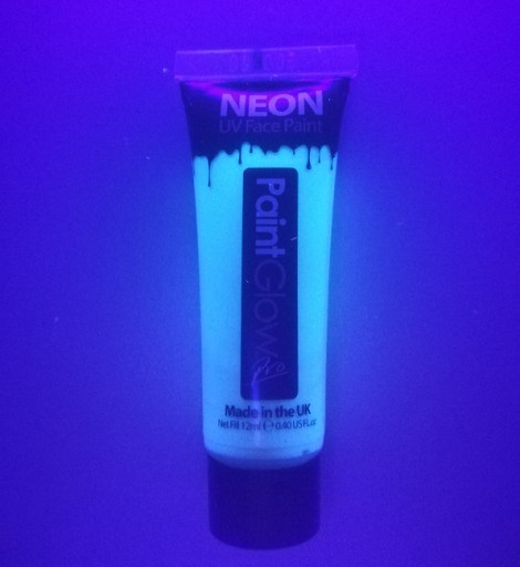 PaintGlow UV Neon Face Paint są to farby, które świecą w świetle ultrafioletowym. Można nimi malować na ciele i na twarzy. Farbki są zapakowane w tubki po 12ml. Farbami należy malować na czystej odtłuszczonej skórze. Świetne na imprezy urodzinowe i inne okazje do zabawy. Bardzo łatwo zmywają się woda z mydłem. Firma PaintGlow posiada certyfikat ISO 9001:2008, co oznacza, że wszystkie produkty Paintglow są kosmetycznie certyfikowane do najwyższych standardów. Na zdjęciu widać jak kredki świecą w świetle ultrafioletowym, aczkolwiek zdjęcie nie oddaje ich rzeczywistych możliwości w UV. Kolejna fotografia pokazuje, jak farba wygląda, po jednokrotnym malowaniu na skórze kolorem białym. Jedną farbą 12ml namalowaliśmy prostokąt o rozmiarze 30cm x 17cm. Proszę wziąć pod uwagę, że jest to produkt kosmetyczny, gdzie krycie i wydajność podlegają indywidualnej ocenie klienta.