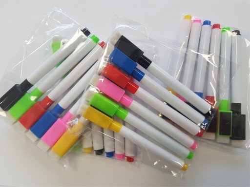 Na tej aukcji kupujecie zestaw 6 pisaków suchościeralnych z gumkami oraz magnesami pozwalającymi umieścić mazak na lodówce: