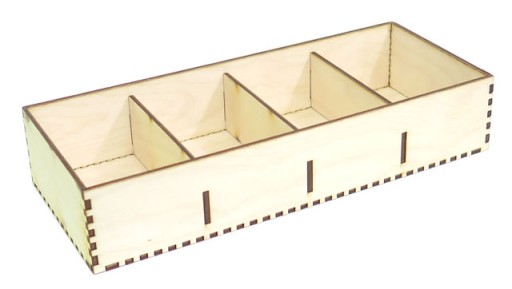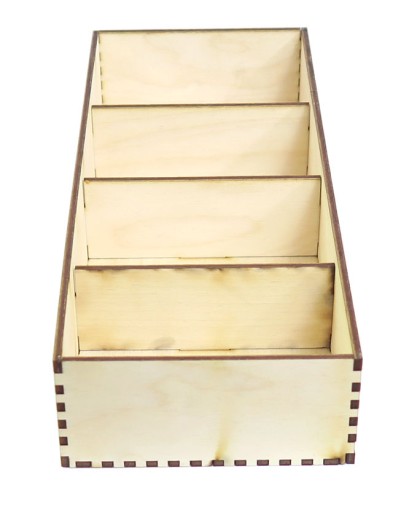 Pudełko ze sklejki o grubości 3mm z 4 przegródkami o zewnętrznych wymiarach: 25.5x10.6x5cm