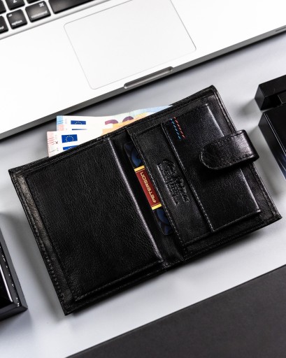 Portfel męski skórzany zapinany, dwuczęściowy, złożony z portfela głównego i wyjmowanego etui na karty i dokumenty, bardzo starannie wykonany z doskonałej jakości naturalnej skóry.