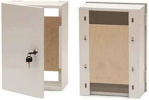 Obudowy z tylną ścianką wykonaną z płyty perforowanej oraz skrzynki z dodatkowym zabezpieczeniem (z kłódką):