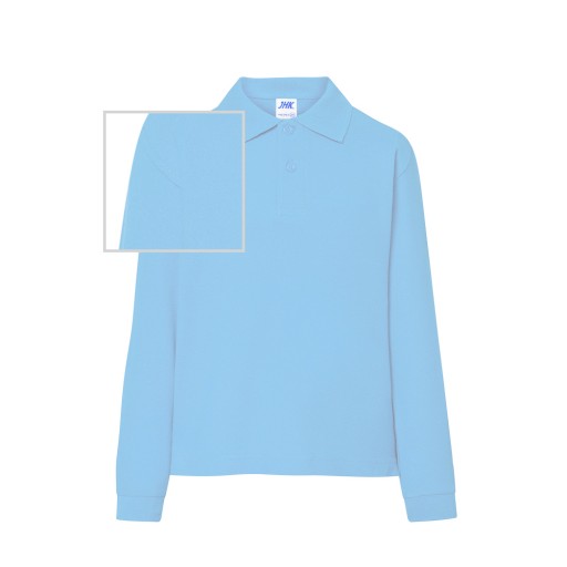 Polo młodzieżowe z długim rękawem zakończone ściągaczem. Zapinane na dwa guziki. Boczne rozcięcia. Łatwo usuwalna metka. 100% stabilizowana bawełna czesankowa pique.