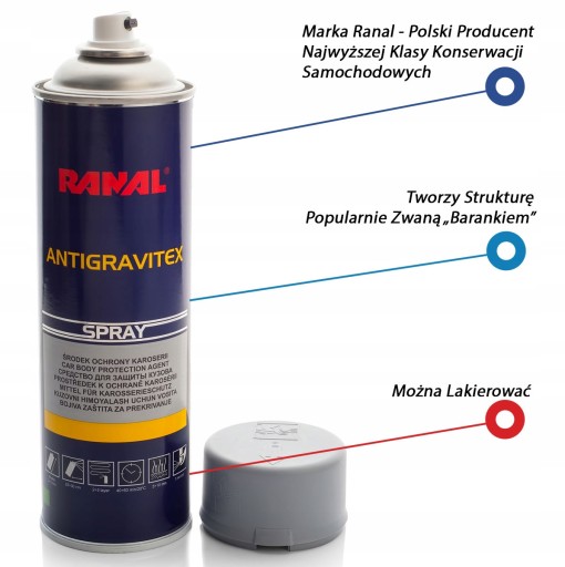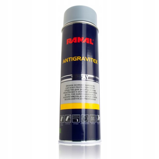 RANAL Baranek Szary Spray jest idealny do ochrony progów, podwozia oraz innych elementów karoserii samochodowej przed korozją i uszkodzeniami mechanicznymi.