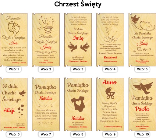 czerwone elementy na wzorach przedstawiają miejsca, które są personalizowane, otrzymują Państwo na produkcie kolor naturalnego graweru. Do każdego wzoru możemy dodać datę.