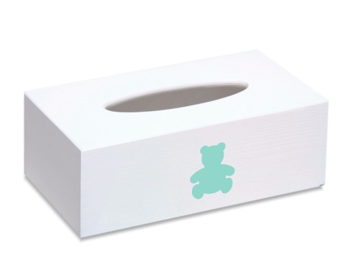 Kolekcja dodatków do pokoju dziecka miś to niepowtarzalne skrzynie na zabawki, pudełka na chusteczki, pojemniki na kredki i wiele innych. Chustecznik prostokątny dostępny na tej aukcji, prócz tego, że jest praktyczny, dzięki dekorowi stanowi ładną ozdobę dziecięcego zakątka. Pojemnik został wykonany z drewna, w całości szlifowanego i pomalowanego białą farbą. Dodatkowo ozdobiony motywem misia, który jest naniesiony przy użyciu kolorowych farb. Wszystkie użyte materiały są bezpieczne dla dzieci i posiadają niezbędne atesty. Od spodu zamykany jest na przesuwne wieczko.