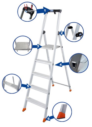 Profilowane, duże stopki z miękką wkładką zabezpieczają przed poślizgiem drabiny oraz chronią delkatne podłoże podczas użytkowania w pomieszczeniach. Wpusowe połączenia stopni z podłużnicami gwarantują wytrzymałość i stabilność podczas wykonywanych prac. Zaawansowane technologicznie przeguby ze stalowym rdzeniem oraz ryflowana platforma umożliwiają zastosowanie drabiny również na zewnątrz.