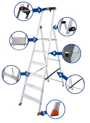 Profilowane, duże stopki z miękką wkładką zabezpieczają przed poślizgiem drabiny oraz chronią delkatne podłoże podczas użytkowania w pomieszczeniach. Wpusowe połączenia stopni z podłużnicami gwarantują wytrzymałość i stabilność podczas wykonywanych prac. Zaawansowane technologicznie przeguby ze stalowym rdzeniem oraz ryflowana platforma umożliwiają zastosowanie drabiny również na zewnątrz.