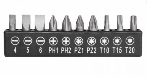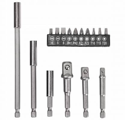 Komplet 10 szt. profesjonalnych bitów 25 mm 1/4" w zestawie z 3 przedłużkami i 3 adapterami do wkrętarki.