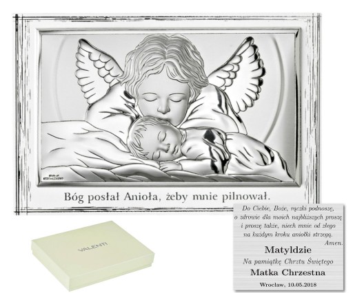 Piękna pamiątka włoskiej firmy VALENTI przedstawiająca wizerunek Anioła Stróża czuwającego nad śpiącym dzieckiem. Aniołek troskliwie całuje dziecko w główkę, jednocześnie dbając o jego komfortowy sen i bezpieczeństwo. Na obrazku znajduje się napis " Bóg posłał Anioła, żeby mnie pilnował." Ramka otaczająca obrazek została wykonana z wysokiej jakości drewna w białym kolorze. Obrazek z pewnością będzie odpowiednim upominkiem z okazji Chrztu Świętego, Roczku lub Narodzin dziecka.