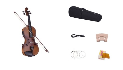 W komplecie znajduje się smyczek, podstrunnik, komplet strun, kalafonia do smarowania smyczka, podbródek, mikrostroiki do każdej struny. Jest więc wszystko co jest potrzebne do rozpoczęcia nauki.