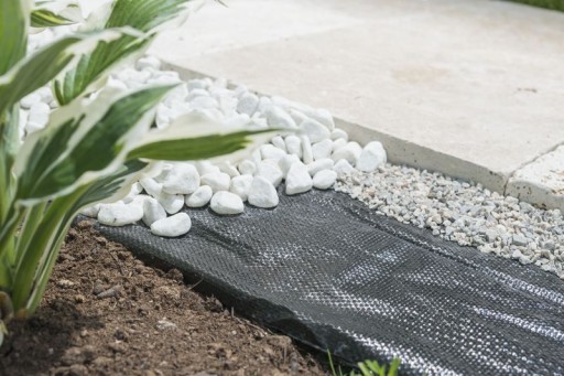 - Następnie agrotkaninę można przysypać korą lub ozdobnym żwirem.