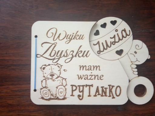 Przód zdobi radosny wzór a w środku znajduje się wierszyk + imienne pytanie.