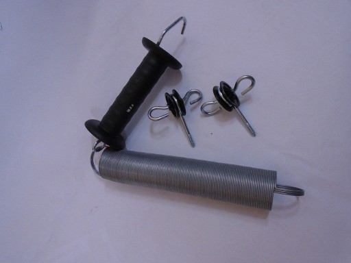 - 1 x uchwyt bramowy z hakiem z ogranicznikiem naciągu kolor uchwytu może się zmieniać w zależności od dostawy (niebieski/czarny)