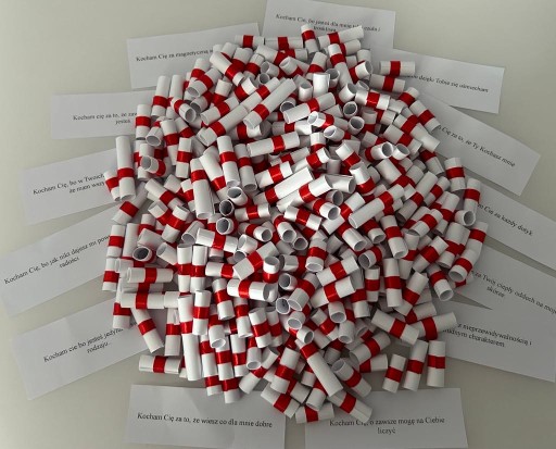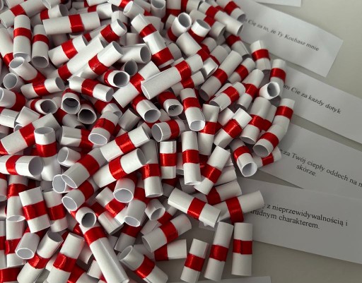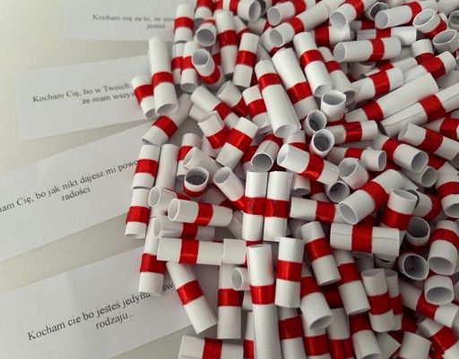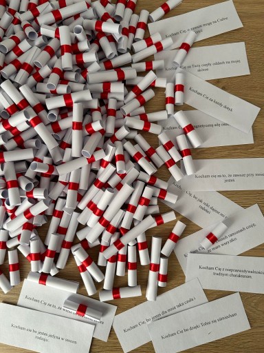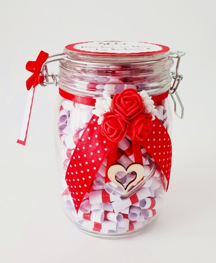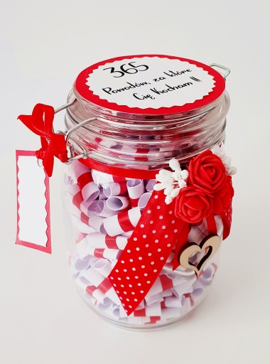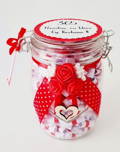 - Słoik jest szklany i zawiera 365 karteczek zwiniętych w rulonik, na których znajdują się teksty i "dlaczego Cię kocham"