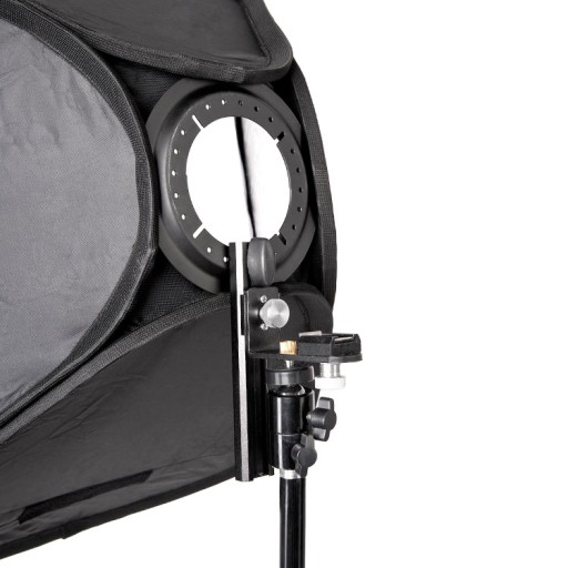 Mocowanie lampy jest przesuwne: tył-przód, dzięki czemu można prawidłowo dobrać odległość lampy od softboxa. Uchwyt posiada regulację pionową, pozwalającą dopasować położenie softboxa do wysokości danego modelu lampy błyskowej (o różnych gabarytach). Dzięki takiemu rozwiązaniu, można również umieścić pod lampą fotocelę, kostkę synchro lub odbiornik wyzwalacza radiowego.