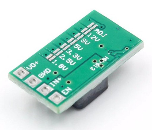 Moduł miniaturowej przetwornicy step-down o regulowanym napięciu wyjściowym. Moduł umożliwia również ustawienie napięcia na stałe, dostępne poziomy napięć: 12V, 9V, 5V, 3.3V, 2.5V, 1,8V. Przetwornica jest typu step-down, czyli obniżająca napięcie, dlatego napięcie na OUT zawsze będzie niższe niż napięcie IN. Przetwornica posiada wyprowadzenia zgodne z stabilizatorami L78xx, dzięki temu może go z powodzeniem zastąpić.