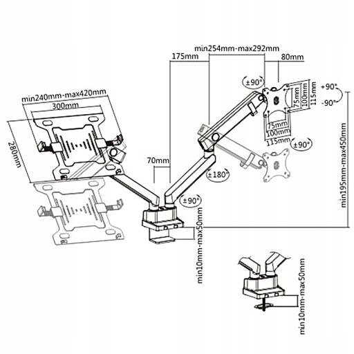 Ramiona wykonane zostały z wysokiej jakości aluminium. Wyposażone są w wytrzymałą klamrę montażową, która umożliwia mocowanie do blatu lub innych powierzchni płaskich. Idealne do zastosowania m.in. w biurze i domu - bez wiercenia dziur w biurkach lub ścianach.