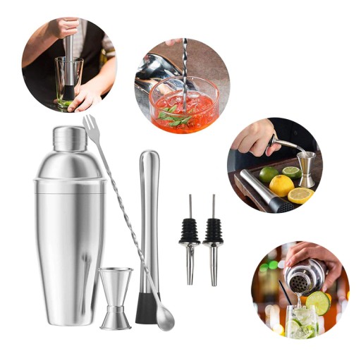 Zestaw zawiera wszystkie niezbędne akcesoria do przygotowania koktaji - duży shaker, miarkę, ubijak, łyżkę i nalewaki.