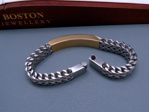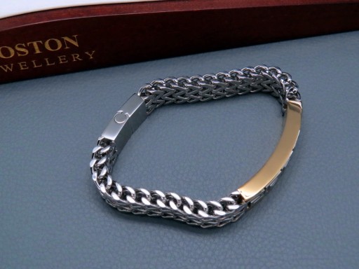 W tej ofercie prezentujemy wyjątkowo elegancki model bransolety męskiej, który wykonany jest z NAJWYŻSZEJ JAKOŚCI STALI CHIRURGICZNEJ 316L platerowanej 18k złotem. Model ten wyróżnia bardzo elegancki i unikatowy splot elementów, na których przepięknie załamuje się światło. Całość na dłoni robi niesamowite wrażenie !!! Jest to jeden z najciekawszych i najlepiej sprzedających się modeli w ostatnim czasie !