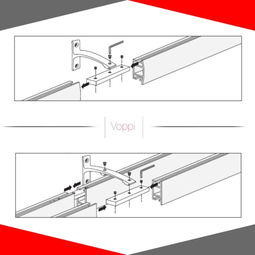 Jeżeli karnisz przekracza 240cm, połącz go za pomocą łącznika oraz dodatkowego wspornika montażowego. Wsuń łączniki w profile oraz dopasuj wspornik montażowy i dokręć śruby za pomocą kluczą imbusowego. Wszystkie elementy wraz z kluczem imbusowym dołączone są do zestawy montażowego.