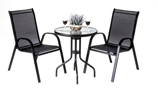 ZESTAW MEBLI OGRODOWYCH idealny do Twojego ogrodu. Stelaż został podwójnie lakierowany proszkowo, co idealnie przystosowuje ten produkt to zastosowania wewnątrz jak i na zewnątrz. Siedzisko krzesła oraz oparcie zostało zrobione z czarnego, elastycznego obicia tekstylnego tak, aby maksymalnie zwiększyć wygodę. Posiada ono dwa oparcia boczne. Użyte materiały nie wymagają częstej konserwacji, są odporne na warunki pogodowe i nie wymagają specjalnych środków do pielęgnacji. Nóżki są dodatkowo zaopatrzone w nakładki z tworzywa sztucznego. Stół posiada blat z białej hartowanej szyby o gr. 5 mm.