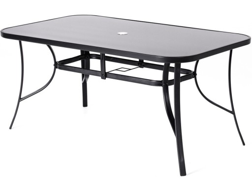 Stół ogrodowy idealny do Twojego ogrodu. Stelaż został podwójnie lakierowany proszkowo, co idealnie przystosowuje ten produkt to zastosowania wewnątrz jak i na zewnątrz. Użyte materiały nie wymagają częstej konserwacji, są odporne na warunki pogodowe i nie wymagają specjalnych środków do pielęgnacji. Nóżki są dodatkowo zaopatrzone w nakładki z tworzywa sztucznego.Stół posiada blat z czarnej hartowanej szyby o gr. 5 mm, z otworem na wstawienie parasola ogrodowego.